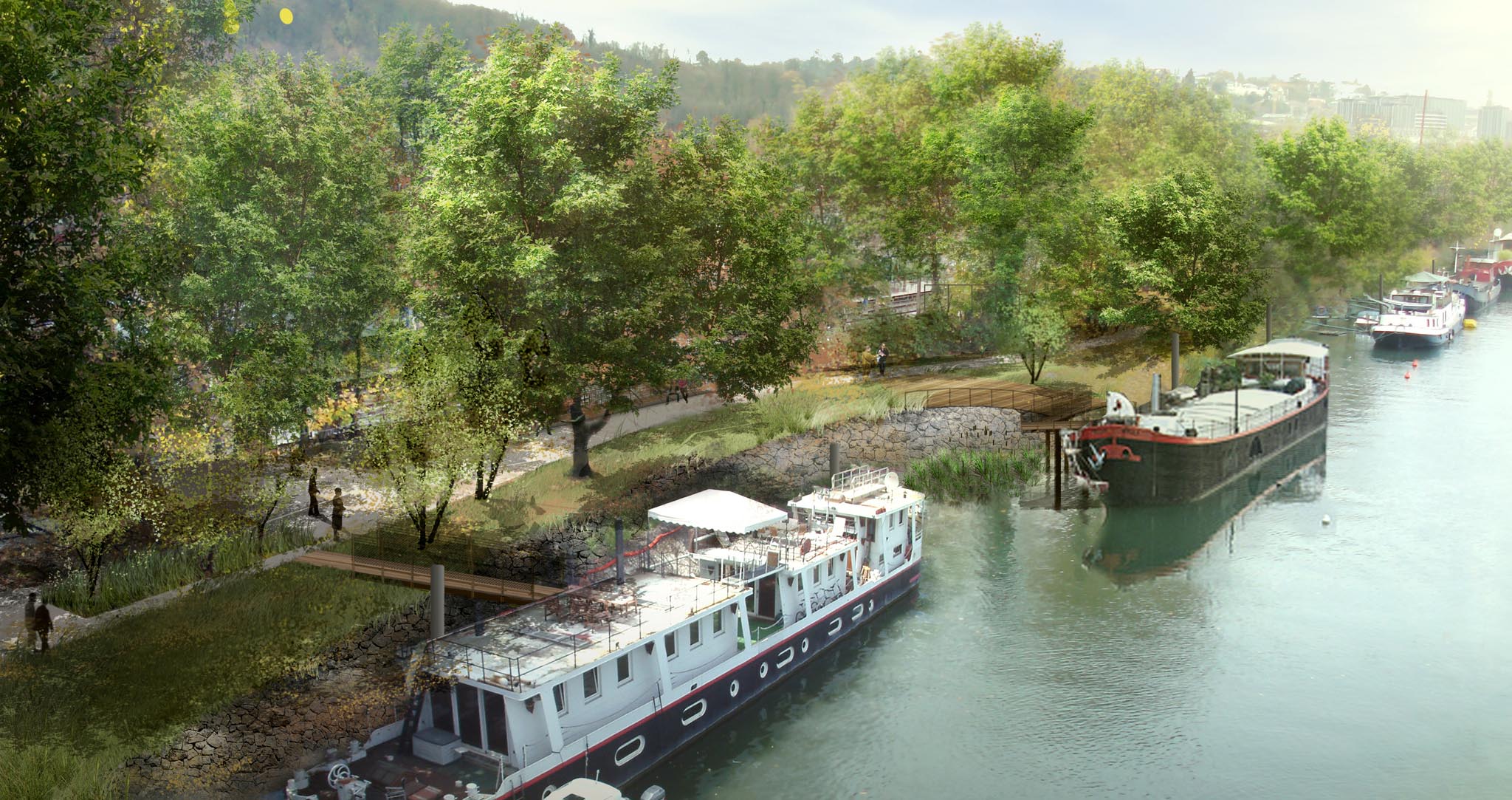 Quai Le Gallo - La rive droite de la Seine le long du quai Le Gallo souffre d’un manque de visibilité dans le paysage en raison de problèmes d’accessibilité publique depuis l’espace urbain. Cette rive a progressivement été appropriée par les occupants de bateaux-logements. L’intervention vise à redonner vie au chemin de halage. Pour signaler chaque entrée publique, une structure architecturale légère sera créée, accompagnée d’une mise en scène paysagère qui transcendera la simple fonctionnalité des barrages flottants et symbolisera la connexion entre la ville et le fleuve. Les opérations prévues dans cette première phase devront éviter toute procédure réglementaire (tel qu’un dossier d’autorisation en vertu du Code de l’Environnement).